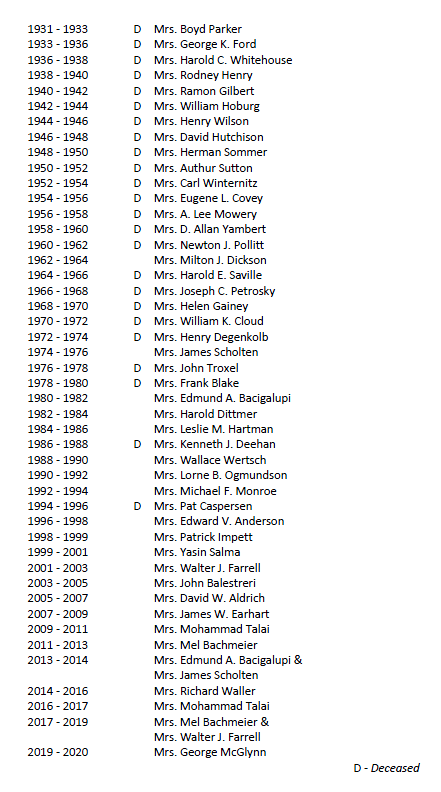1940-1942: We sponsored Victory Gardens, First Aid classes and organized a Red Cross Production Unit the Monday after Pearl Harbor was bombed. We sewed and knitted each Monday with Canteen workers serving a hot lunch, cost 25 cents, the receipts paid for new kitchen cabinets.